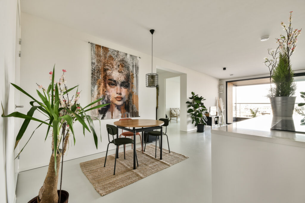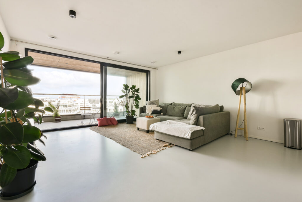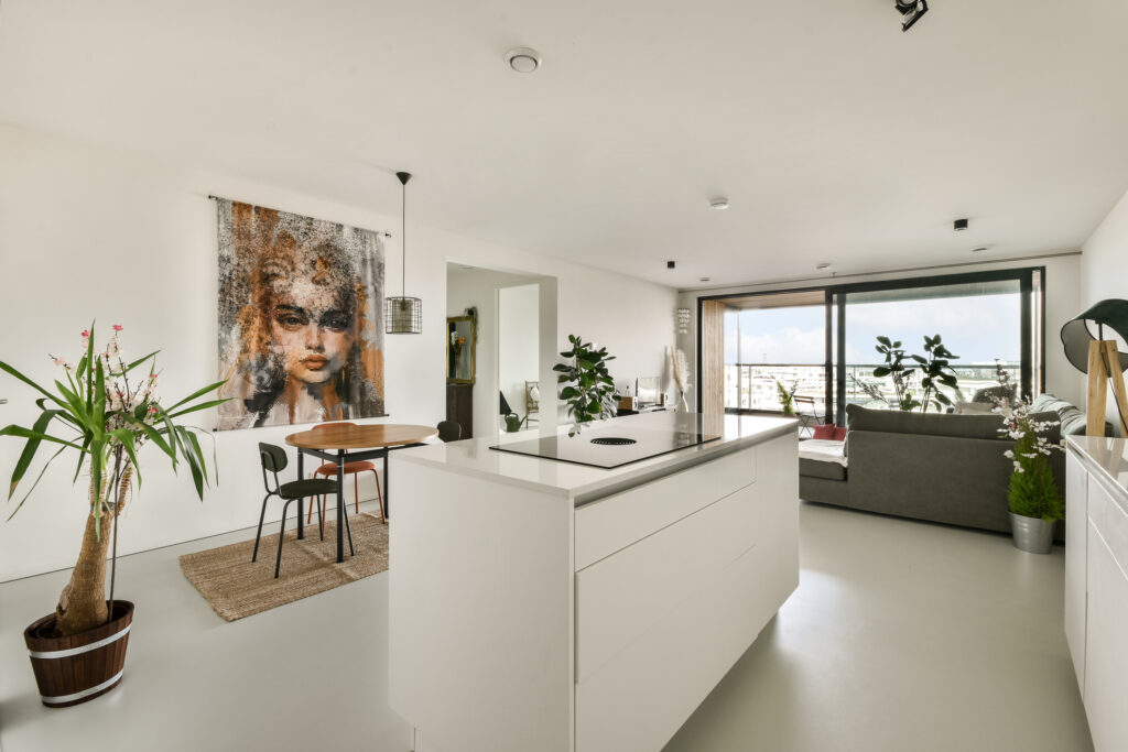 De woonkamer is royaal en licht, met verdiepingshoge ramen en een schuifpui naar het terras op het noordwesten. Hier geniet je van prachtige vergezichten en spectaculaire zonsondergangen. De open Poggenpohl keuken met kookeiland is strak en greeploos afgewerkt en voorzien van inbouwapparatuur van Miele/AEG, waaronder een koelkast, vriezer, oven, combi-oven, vaatwasser, Quooker en geïntegreerde afzuiging.