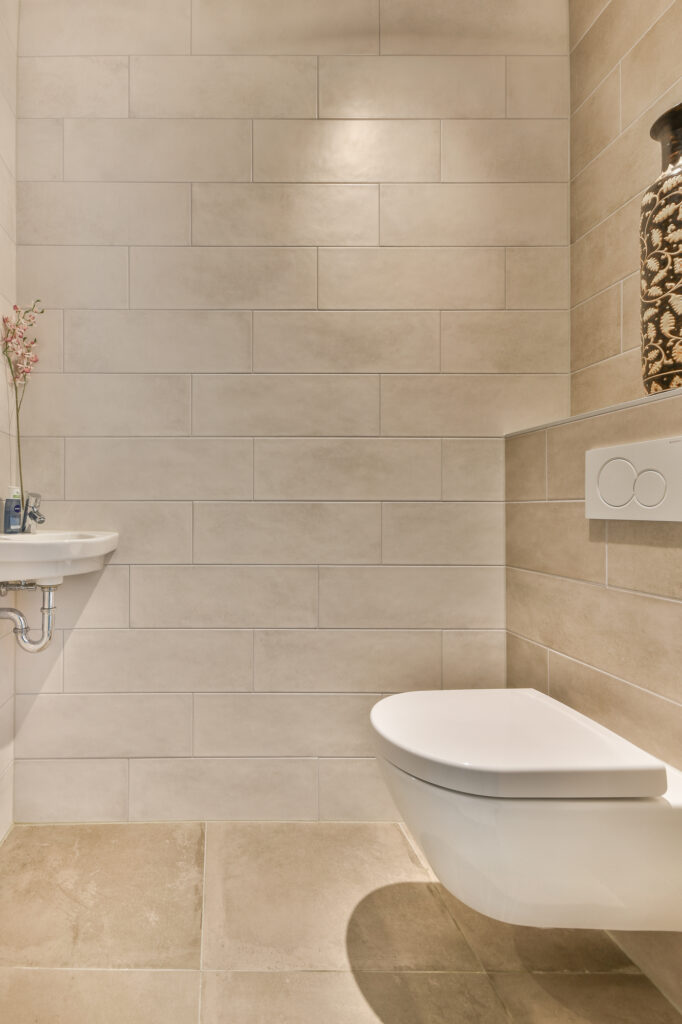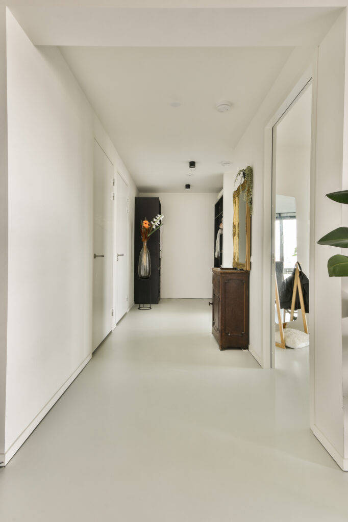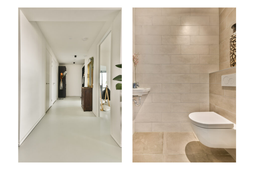 De hal biedt ruimte voor een garderobe en geeft toegang tot het eerste toilet met luxe sanitair van Villeroy & Boch.