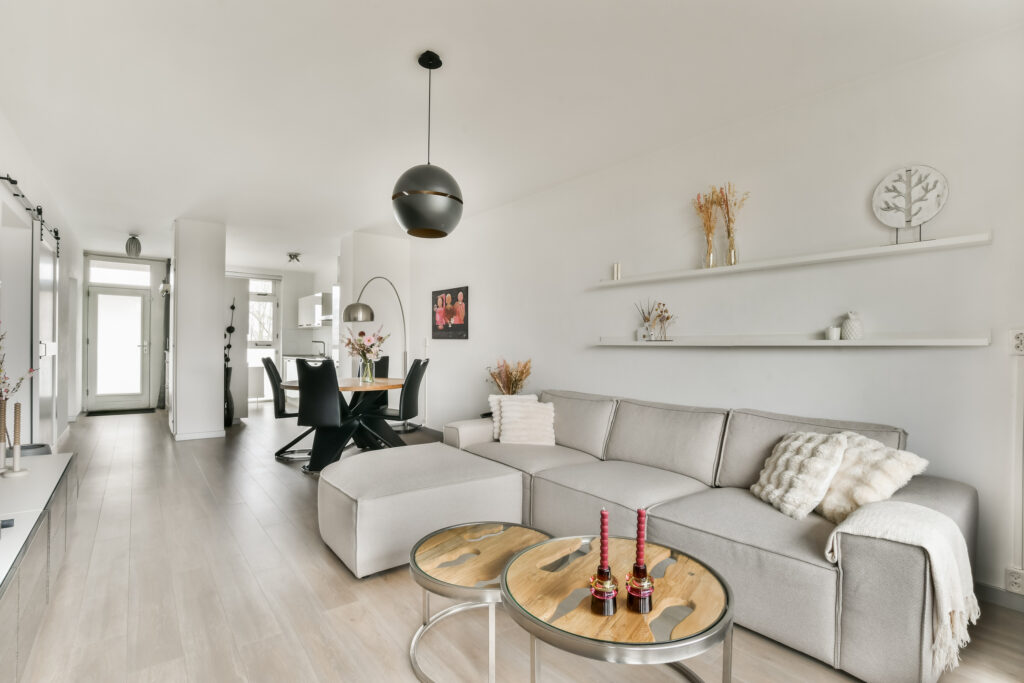 Through the entrance of the apartment, you enter the hallway, which provides access to the various rooms. At the front of the property is the kitchen, equipped with modern built-in appliances. The kitchen is connected to the spacious and bright living room with dining area.