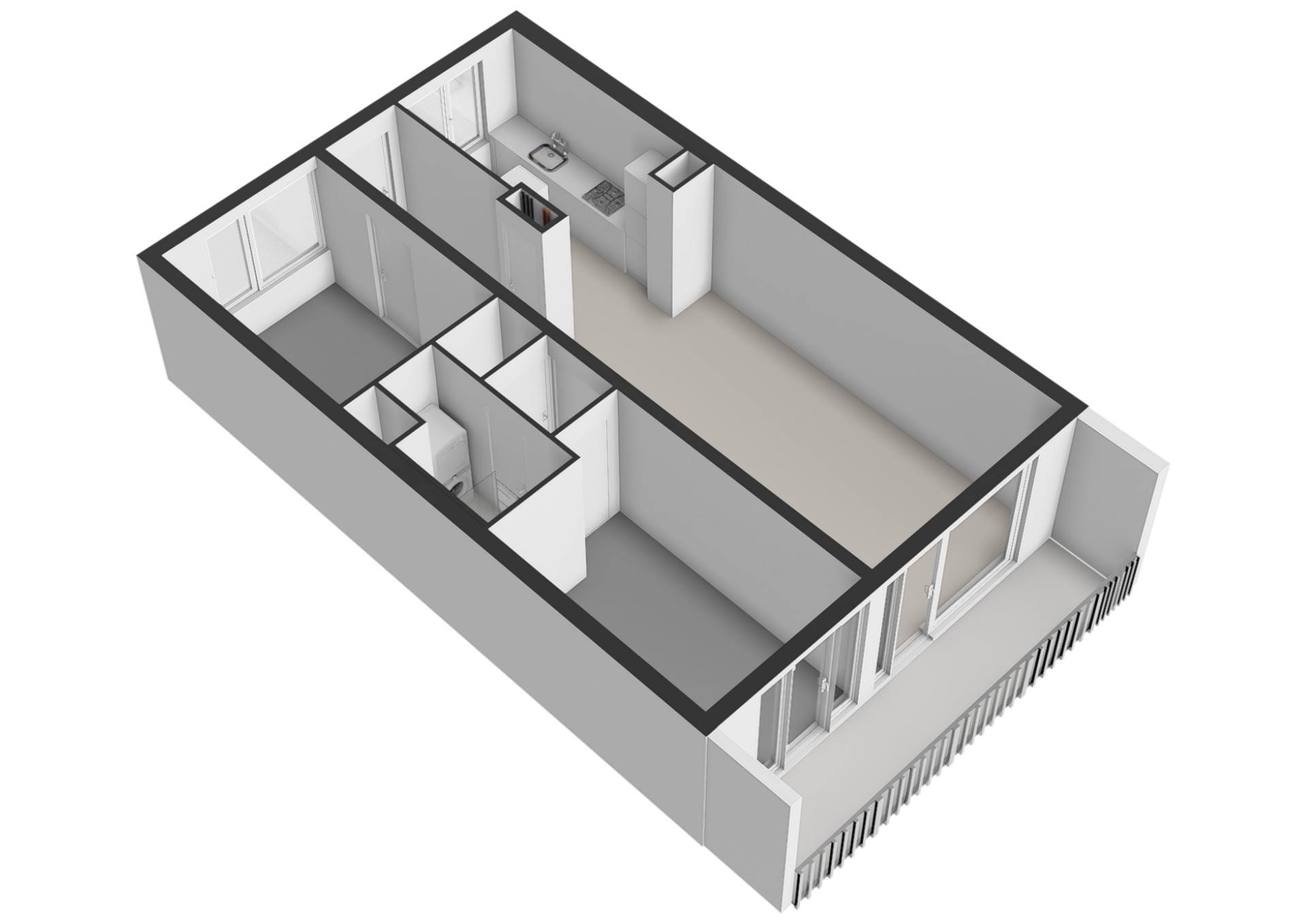 Via de centrale hal bereik je het separate toilet, de badkamer en de overige kamers. De badkamer is voorzien van een douche, wastafel en aansluiting voor de wasmachine. Daarnaast beschikt het appartement over twee slaapkamers. De grote slaapkamer heeft toegang tot het balkon.