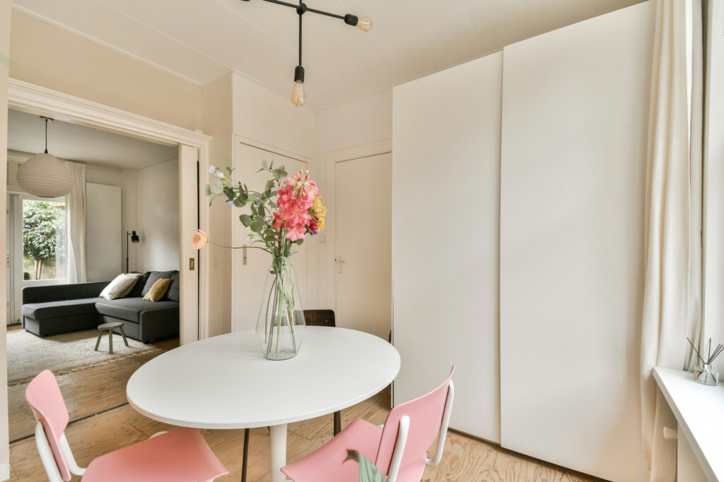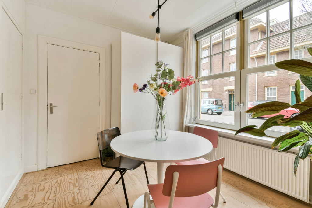 Aan de linkerzijde van de hal kom je in de eet- en woonkamer. Deze ruimtes worden gescheiden door originele houten glas-in-lood schuifdeuren, wat zorgt voor een prachtige, karakteristieke uitstraling. Dankzij ramen aan zowel de voor- als achterzijde geniet je hier het hele jaar door van veel natuurlijk licht. De huidige eetruimte kan ook worden gebruikt als 2e slaapkamer.
