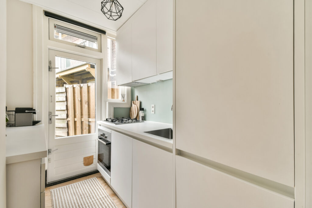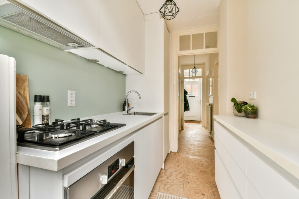 Aan de achterzijde ligt de moderne keuken, voorzien van inbouwapparatuur zoals een oven, inbouw was-droogcombinatie, vaatwasser en kookplaat. Door de slimme indeling is er voldoende werkruimte om uitgebreid te koken. Vanuit de keuken heb je toegang tot de tuin.